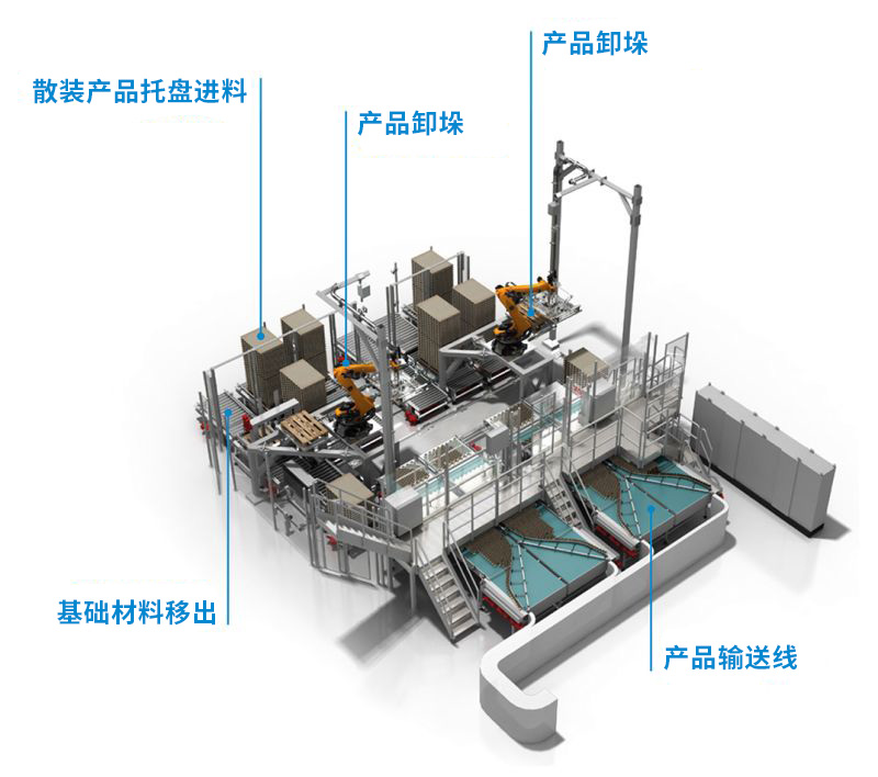设备分别有:散装产品码垛机,散装产品卸码垛机,散装产品卸垛机(适用于单一和多种口味的产品)。